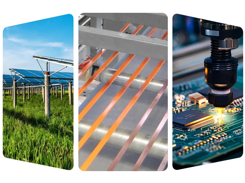 • فوٽووولٽڪ فيلڊ: فوٽو وولٽڪ ويلڊنگ ربن ۽ بسبارن جي وڏي پئماني تي پيداوار بجليءَ کي موثر طريقي سان هلائڻ ۾ مدد لاءِ.
